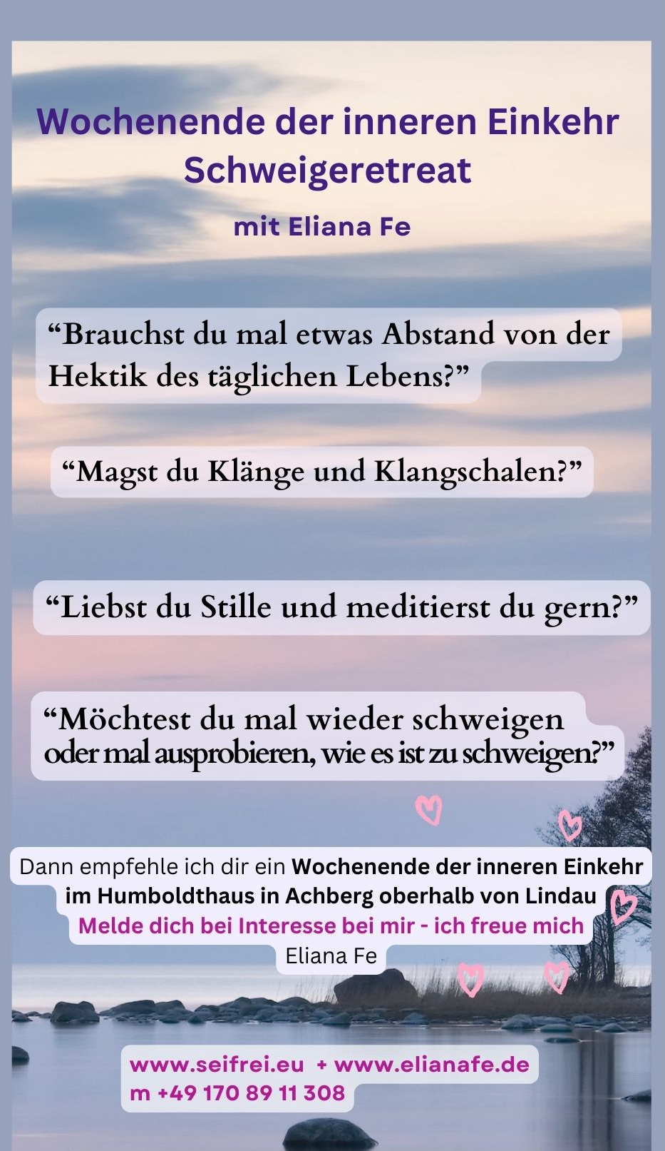 Wer von der Hektik des täglichen Lebens mal etwas Abstand braucht, wer Stille liebt, wer gerne meditiert und auch Klangschalen und Klänge mag und wer mal ausprobieren will, wie es ist, zwei Tage lang zu schweigen, der/dem empfehle ich dieses Wochenende. Das März-Retreat – 21.-23.03 2025 – findet statt. Es hat noch freie Plätze.